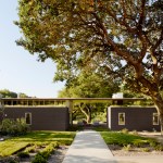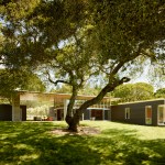 A 3,890-square-foot home anchors a new complex of structures—including a guesthouse and a carport—in a 22-acre oak meadow in California’s wine country. Designed by San Francisco–based firm Turnbull Griffin Haesloop to enhance the client’s indoor–outdoor summer living, the house is configured as a low-lying L-shaped mass with a thin roof floating above the public living space.