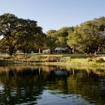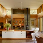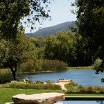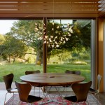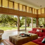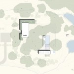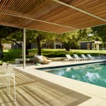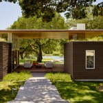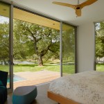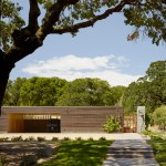 From the architects. The site, a meadow dotted with magnificent oaks, gently slopes down to a spring fed pond creating an unusually lush landscape. The owners requested that the house be designed for outdoor/indoor summer living. They wanted guests to have easy access to the pool and pond beyond. The design frames the verdant oak meadow and pond within the larger landscape. A thin floating roof reaches across the primary outdoor living space to frame the entry and create a dramatic threshold from the car court to the pond beyond. The bedrooms, kitchen and support spaces are housed under a living roof that visually links the house to the surrounding landscape. The pool house extends the outdoor living with generous shade trellises and includes a playroom, changing room and guestroom as well as space for the solar hot water and pool equipment. A fire pit and small dock further extend the outdoor living experience to the pond’s edge. The project is designed to be a net-zero home. Passive cooling strategies, including a cool roof, living roof, heavy insulation, operable windows and large overhangs, allow the house to remain comfortable without the use of air conditioning. Photovoltaic powered electric heat pumps provide hot water for in-slab radiant heat and solar hot water panels provide hot water for the pool.