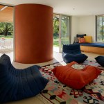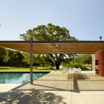 The house achieves net-zero status through passive cooling strategies, including a white roof above the living room, a green roof above the lower-ceiling spaces, closed-cell insulation throughout, and operable windows shielded by wide overhangs. Its private spaces—which include four bedrooms in the main house and a fifth in the pool house—are simply detailed with built-in amenities rendered in warm wood finishes. The site’s existing oak trees were preserved, and lend an air of tradition and history to the new structures, and the freestanding pool house features shade trellises that recall the main house’s outdoor living room at a more intimate scale. The complex’s spaces give residents and visitors well-framed views that establish one’s place in the broader landscape. — E.K.