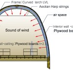 Inside the chapel, a series of 0.72 mm SUS wires are placed; when the air flows over them, they resonate similar to the strings of a harp, producing a beautiful sound. The speed of wind can be altered by a set of apertures at the east and west side of the building. These apertures can be operated, altering the tone of the sounds.