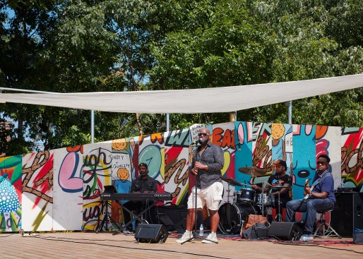 Eastlake Studio transformed these plywood artworks into “Sounding Boards” murals as the centerpiece of Sounding Boards Garden, a permanent installation that makes use of a vacant lot near North Lawndale’s Harmony Community Church in Chicago. The multi-purpose design intervention, which was part of the Chicago Architecture Biennial’s “The Available City” edition, uses the plywood murals as structural materials to create a semi-enclosed community space. Bricks paving the garden are engraved with names of victims of gun violence and addiction, and a mural-clad stage and built-in seating provide venues where visitors can amplify progressive voices. Instead of a vacant lot, the Sounding Boards Garden has become a platform for conversations, music, and performing arts, and as a space for quiet contemplation for the community.