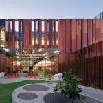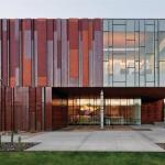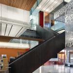 There are two main entrances, one through the public façade, the other on the campus side. The copper skin continues inside to mark the vestibules, and the floors are polished terrazzo with crushed mirror aggregate that reflects the sunlight that enters through shaded widows. Four large staircases—with mill-finished steel panels supporting the handrails—mark the quadrants of the building. Starting at the landings, water-jet-cut aluminum panels overlay the steel, with a different pattern for each stair. The four motifs are abstractions of asters, citrus, sorghum, and cotton, the four major crops grown in the area’s not-too-distant agricultural past. The patterns continue on the glazed balustrades of each quadrant of the second level as transparent vinyl appliques.