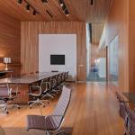 To bring warmth to the largely glass-and-metal interior, the designers introduced a wood ceiling. Small wood planks of varying thicknesses and depths are nailed individually to the ceiling—“It’s easy to make something random,” Richärd says, “it would be a lot more difficult if we were asking someone to create a slick surface”—and spaced slightly to expose an acoustic material that allows the sculptural ceiling to double as a sound-soak. Snaking across the ceiling plane is a light trough that contains all of the utilities for the building, including mechanical, electrical, and data. Fluorescent strip lights are directed to bounce off of the ductwork. This creates a diffuse glow that filters through frosted panels and provides all of the library’s ambient light.