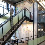 The building lab functions are housed in one three-story wing, and the classroom and office functions are housed in a separate three-story wing. The separation of program areas allows the building construction and systems to respond to the specific requirements of each program group. At the joint between these two structures, the building opens, allowing for the main entry – a large monumental stair and open study areas for the students.