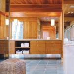 An elevated tub now hugs the outside wall. A large two-place shower stands in the center of the room, sharing the tub’s ocean view through a pair of high windows of its own. Goolrick converted the original shower to a steam room, relocated and reduced two oversize toilet compartments, and replaced two separate sink stations with a single 20-foot-long concrete-topped vanity. Faced in oak to match the original ceiling and wall paneling, the cabinet floats against a wall that is mirrored both above and below it. Other materials—watery blue ceramic tiles at the floor, blue glass tiles in the shower—reflect the house’s proximity to the sea. “Almost anywhere you are in here you see the ocean,” Goolrick says, “so it’s really pulled into the room.” Our judges approved. “I could picture myself going into this bath in the morning,” said one. “It gives you a good feeling.”