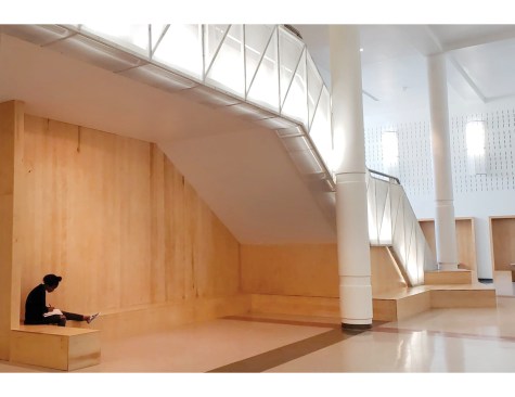 The main site of the designers’ intervention: an enormous staircase, descending in stages to the lower concourse, formerly sided with crude metal banisters and housing a cluttered, ad hoc storage space in its zigzagged undercroft. Recognizing an opportunity, the team refit the inner flank of the staircase with translucent panels, up-lit with concealed lighting that gives students a perfect, TikTok-ready bit of scenography for swanning downward to the lower level; when they get there, their friends can cheer them from the ample wooden seating that now clusters around the foot of the steps and fills the once-empty space beneath. For those encumbered by painful memories of late arrivals in a dim, cinder-blocked enclosure, KHA’s project makes it hard not to grumble about those spoiled kids today.