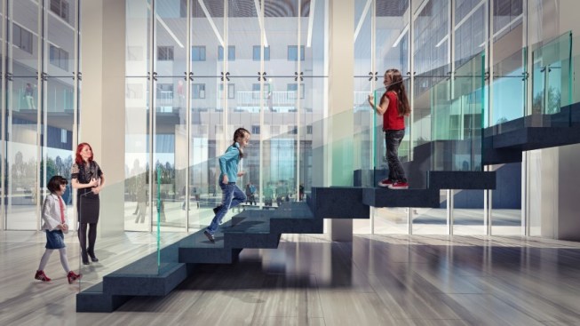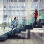 Interior decoration approach has been inspired by corporate color palette and the idea was to transform objects into spaces. The monolithic staircase on the lobby floor is not just a vertical circulation element, but also it supports many planned and unplanned social activities of the students. This approach is repeated throughout the project, such as 30m-long table in the cafeteria or a 50m2 wall reserved for students in the foyer area.