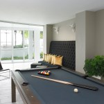The main lobby, located between the two towers, features modern custom furnishings and décor, a bar area, and glass doors that offer expansive water views. The hospitality lounge conveys a laidback, contemporary ambiance with custom light fixtures and dark woods. It has a demonstration kitchen, pool table, and dining table for private events and meetings. There’s also a separate media room with large TVs and modern sofas and chairs.