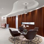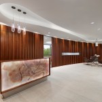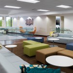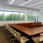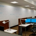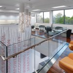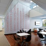 30,000 sf Commercial Office interior fit out of two floors for a technology company headquartered in Hamilton, New Jersey. The company creates software to manage quality control and compliance issues across a broad spectrum of manufacturing, development, and other highly regulated industries. Their business model is divided into two primary areas, client services and innovation. The heart of the project was the creation of a central ‘Forum’ where staff could mix together in a two story space to interact and share ideas in a collaborative way. Various informal seating areas are arranged around a new trapezoidal opening in the floor and wood clad connecting stair which are bracketed by coffee and kitchen areas for staff usage. Low, desking solutions are employed as workstations to create a more open work environment and the handful of glass enclosed offices double as shared conference rooms. The lobby synthesizes a rhythm of wood slats along a gentle arc of wall to join the extended space at the bend in the building’s plan. Large format stone flooring extends from the elevator lobby into the reception area and is pattern cut to follow the curve of the room. Integrated into a series of niches and a linear display bench across from the board room are displayed original inventions from Thomas Edison. The exquisitely crafted, historic artifacts are presented in a museum-like setting and bridge the cutting edge innovation from the early 20th Century to the present innovative products being designed within the new office space.