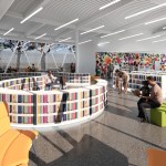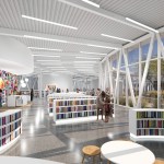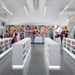 The open interior planning is supported by three sculptural cores extending through the roof plane to screen the rooftop equipment. A neutral and unifying white finish palette emphasizes the visual texture of the books, the finishes of the sculptural furniture and vibrancy of the acoustic paneling also designed through a local artist selection process.