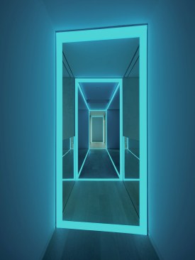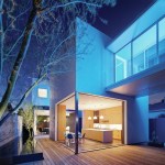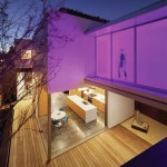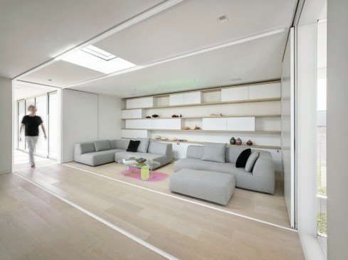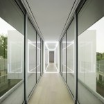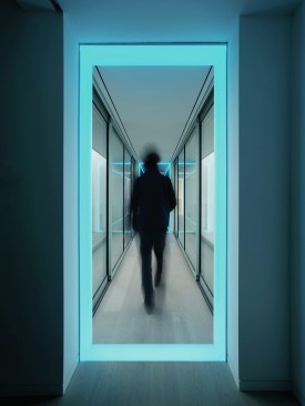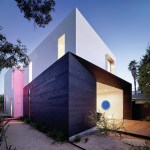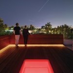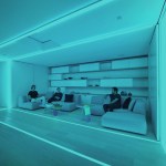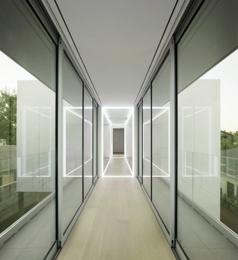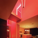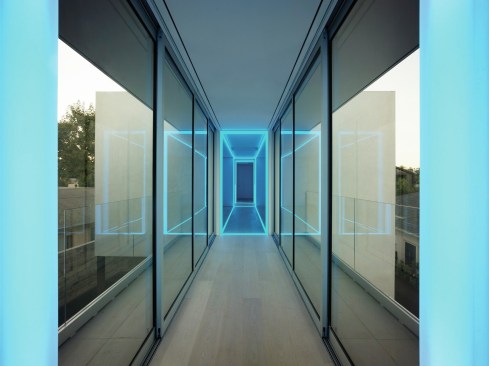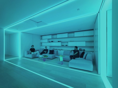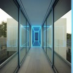The three structures are connected by Girardoni’s artwork Spectral Bridge, which links the first two buildings by a bridge within a glass atrium, and the rear two structures by an exterior bridge. In between the bridges an “art lounge” is situated for colored light and sound baths. Spectral Bridge runs on a program timed to the sunset and sunrise, shifting through color sequences based on a year-long evolution of the spectrum. Family and visitors experience it from the inside as a series of spaces defined by lines of light, volumes of color, and ambient sound. Viewed from the outside, the bridge reads as a glowing physical volume, a light sculpture that unifies the architecture.
