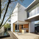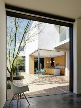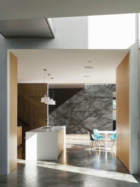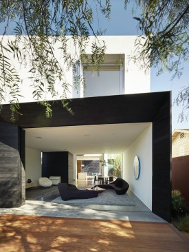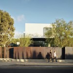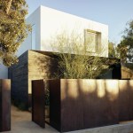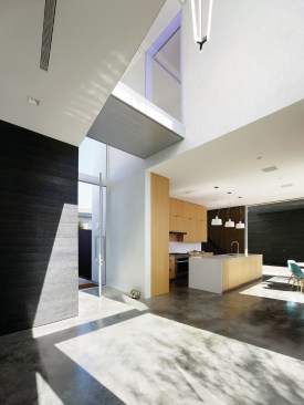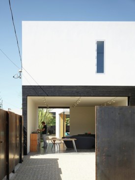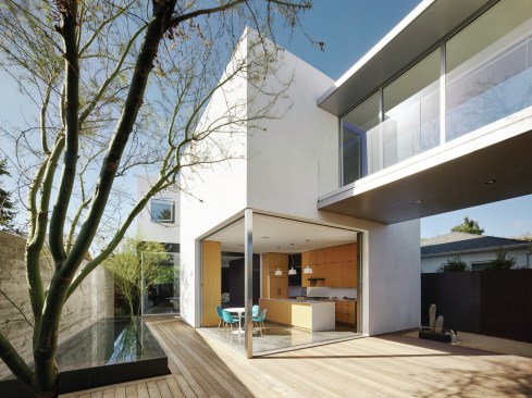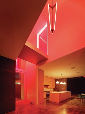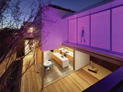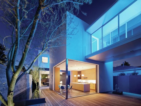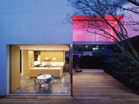 A unique collaboration between the architects and an internationally known artist, this house could be called “a vessel for living and art.” The artist, Johannes Girardoni, creates site- specific projects that explore connections between art, design, technology, and architecture. For this site, a narrow lot in an eclectic urban neighborhood about a mile from the beach, he wanted to build a home that would also be an immersive art experience.