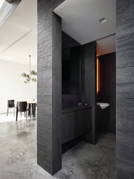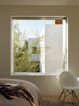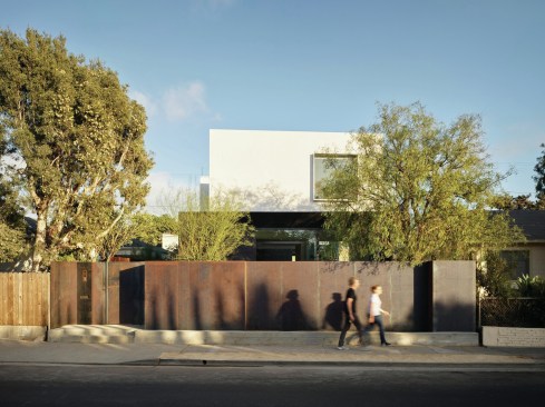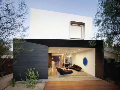 Ehrlich, Yanai, and Girardoni collaborated to integrate art and architecture by creating three two-story living blocks. Sensitively scaled to surrounding houses, these monolithic shapes are disrupted by irregular angles and rotated axes. The upper level is rendered in smooth white stucco while the lower level is clad in charred black shou sugi ban, a technique from eighteenth century Japan. Lined up in a row, the living areas open to discrete outdoor spaces on both the ground and upper floors, forming multiple decks, gardens, and a pool court. A roof deck above the central volume provides another layer of outdoor space and views out over the neighborhood.