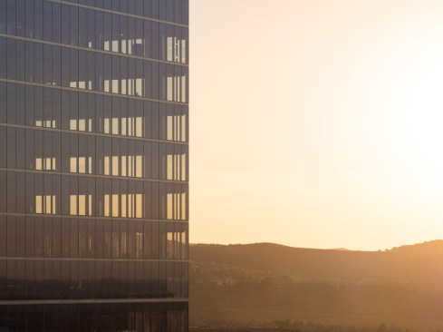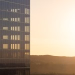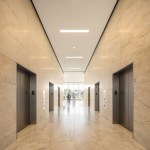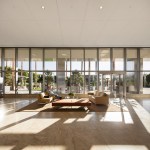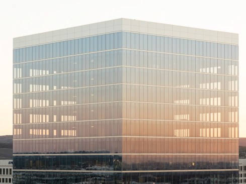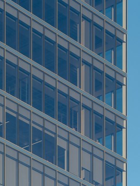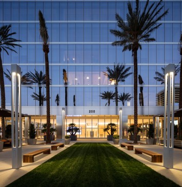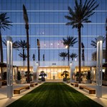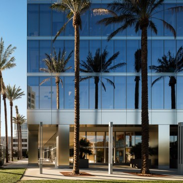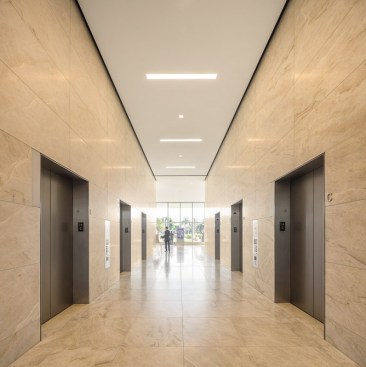 The buildings’ forty-foot column spacing and carefully detailed floor-to-ceiling glass allow for light-filled work space and unobstructed views. The column-free office plates are highly adaptable, facilitating collaboration and connectivity. In the lobbies, recessed cove lighting brings out the warmth of crafted quartzite and wood finishes, while high-speed elevators with destination-dispatch technology provide quick access to every floor. Three associated parking structures help create a dynamic indoor/outdoor work environment, incorporating generously landscaped public spaces and pedestrian connection to the adjacent commercial center. Responding to the changing nature of the workplace, the building and its landscape are equipped with Wi-Fi technology and charging ports.
