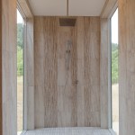 The house also features the latest in renewable energy. Photovoltaic panels provide back-up energy for the residence and a charging station for an electric car, while solar hot water panels meet demand for domestic hot water. A vertical wind turbine, prominent at the site’s entry, contributes to the production of energy at the residence.