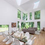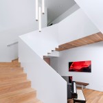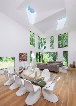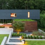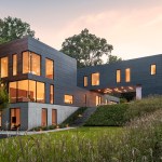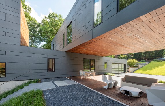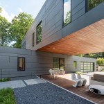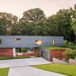 The Split Box House, for a busy working couple and their three children, is located near Emory University and the CDC in Atlanta, Georgia. The client’s wanted a house that is a quiet, restrained, escape from the excessively noisy digital world that overly stimulates their daily lives and is a reaction to the surrounding banal spec homes each a louder spectacle than the next. Simple and clean in its form the house started as a twenty-two foot wide extruded box. That width was chosen based on the distance a reasonable size wood truss can span. This ensured that no interior support walls were required allowing for an uncomplicated open floor plan. Arranged in an efficient pattern to reduce waste the primary exterior cladding of the box is a low maintenance grey cement panel. The panels attached as an open joint ventilated rainscreen system help manage moisture intrusion and reduce energy consumption. Cut to the desired length based on the space requirements of the family, the box is subsequently split into public and private volumes allowing for a clear delineation between functions. The private portion is rotated ninety degrees around the sky-lit stair hall to maximize views to the serene woods behind the house. A complimentary warm ipe wood, alluding to the softer interiors of the house, clads the cuts. The exposed roofs are covered with vegetation to reduce stormwater runoff, mitigate energy consumption and improve air quality. The private functions, comprised of the bedrooms upstairs and the guesthouse on the main level, bridge across a covered breezeway creating an outdoor room with a view corridor to the woods and access to the main and guest house entrances. The public functions move through a series of low and tall spaces culminating in a double height sky-lit space that provides shifting light patterns throughout the day. Lined with cabinets on one side that serve as storage, housing for the entertainment center, fireplace, dining room buffet, refrigerator, and freezer allows the spaces to stay open, clean, and uncluttered. The quiet interiors create a relaxing calm environment that is about the space itself and the views to the outside. A series of site walls, carefully nestled into the steep lot, cascade down the front hill from the street to create a terraced entrance garden that becomes the exposed foundation of the house. Long grasses reinforce the simple geometric forms of the house with their naturally soothing sway and unify the engineered slopes that mitigate the grade differences of the site. The manicured lower lawn adjacent to the grove of trees give way to the ever changing natural beauty of the woods beyond.