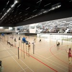 While carrying out of the public events and concerts the hall space is integrated with the multifunctional hall by a broad passage. There are 10 badminton fields in the multifunctional hall, as well as the mobile stage which space can be also used for two additional badminton fields. The hall may be used for volleyball and basketball games (2 fields). The mobile basketball backboards are applied for playing basketball. There is a possibility of functioning of 1 basketball or 1 volleyball field at a time with 6 badminton fields (8 fields when the stage is dismounted) or 2 basketball and 4 badminton (when the stage is dismounted). The tribunes are located along the long side of the fields and that provides for spectators convenient visibility. Under the tribunes there are the sportsmen cloakrooms. For evacuation purposes there are fire escape staircases, direct exits to get outside the building and also a fire-protected zone near the elevator that provides for disable persons protection until the rescue service arrival.