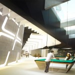 After entering the building the visitors get into the public multifunctional space where they can find the cafe, administrator counter and the staircase to the second floor to the tribunes and billiards zone. The Daily sports club zone adjoins the café zone.