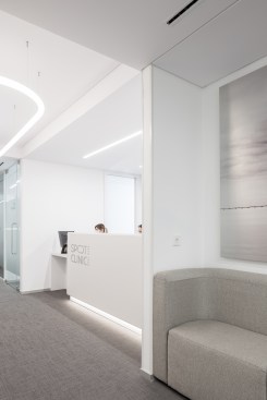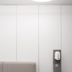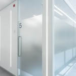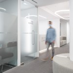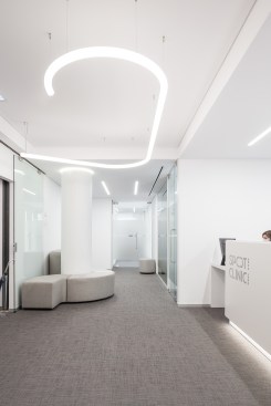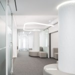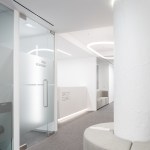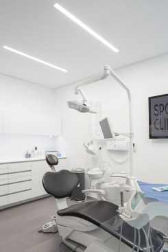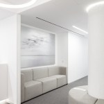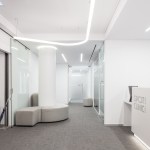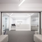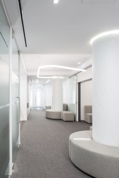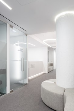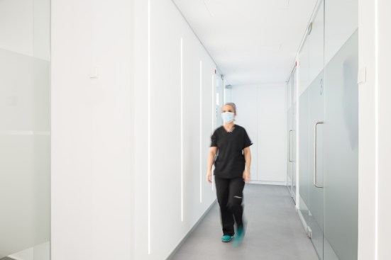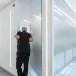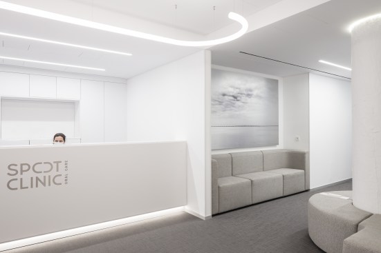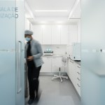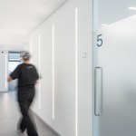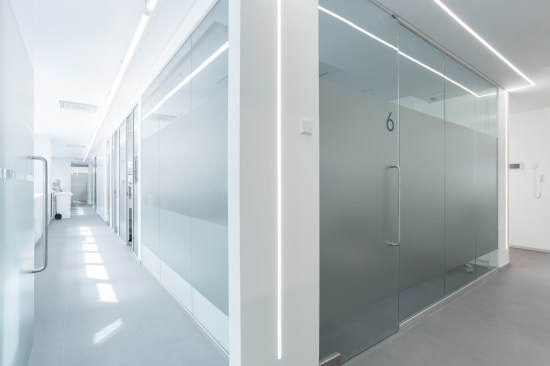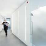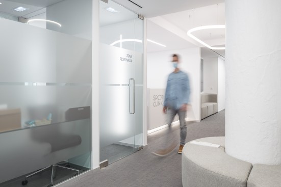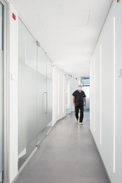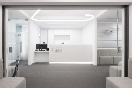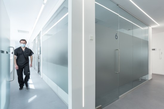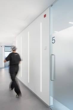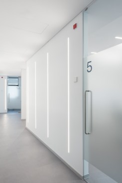 In the corridors, all lighting is done with vertical LED lines on the walls, which gives these corridors a different scale from the rest of the clinic and the waiting rooms are punctuated in the concrete ceilings with suspended lighting, with emphasis on the Alphabet lamp by Artemide.