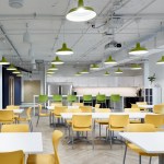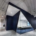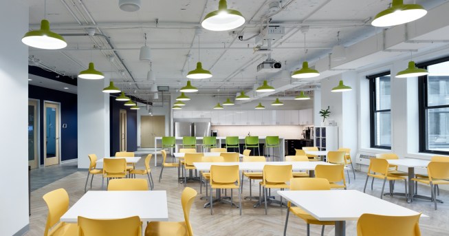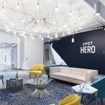 SpotHero selected 125 S Clark Street in Chicago to park it’s new headquarters. This Daniel Burnham building is a perfect fit for the young, but professional SpotHero team with it’s modern twist on historic renovation through it’s building amenities like an artisanal marketplace and outdoor terrace. The office is fun and functional, honoring the company’s history as a startup while promoting a mature, lasting impression to recruit and maintain top industry talent. Bright colors reflect the playful energy of the company’s mission to empower people to get everywhere, easier by connecting them with affordable parking spots through the SpotHero mobile app. SpotHero’s forward-thinking mentality is echoed from the start. In lieu of a traditional reception-style lobby, BOX created a lounge area at the front of the space to welcome visitors and encourage social interaction. Thoughtful details elevate the design of the space throughout, including in the company’s main conference room. A peaked glass corner detail provides a glimpse through the conference room and into the café beyond. Transforming unique conditions, like an unused elevator lobby into a space for heads-down work, allowed the design team to address the challenge of the unique horseshoe shaped floor plate while still maintaining an open office layout. Social areas like the café and conferencing are integrated into the front of the space, creating a natural division for quieter zones in the open office. To address a limited budget, unique design components were included to create a classy but comfortable end product, including: an eye-catching custom chandelier constructed from a composition of LED filament bulbs, bold pops of color in both fixtures and furniture, abstract statement textiles and angled flooring layouts. Ancillary furniture and graphics were sourced and purchased through coordination with the SpotHero marketing team to bring the space together. The resulting design merges sophistication with a youthful spirit, reflecting the character of the SpotHero team.