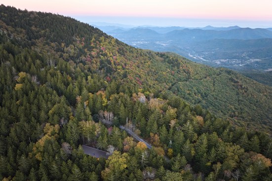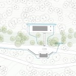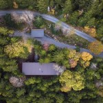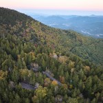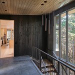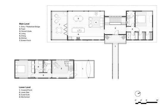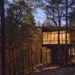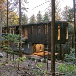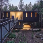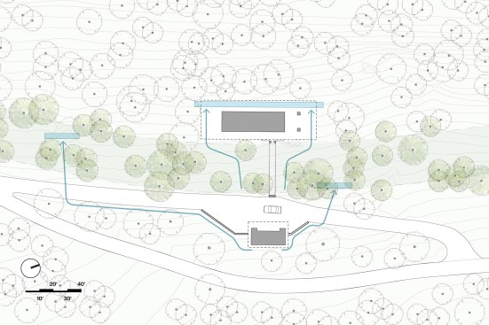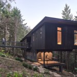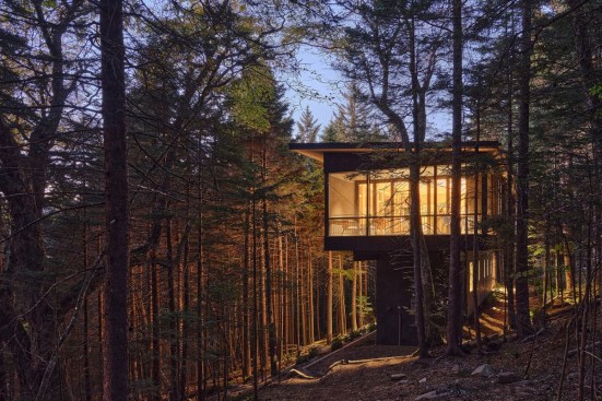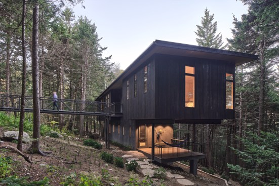 Designed for an avid outdoorsman and environmentalist, this retreat sits on a piece of land high up in the North Carolina portion of the Appalachian Mountains. At a 6,000-foot elevation, the region boasts a unique microclimate and habitat that supports rare flora and fauna—an ecosystem the client did not want to impact both visually and environmentally. To address this concern, the architects devised a modest composition of two cantilevered forms situated downhill from the parking area amidst the trees and clad the upper volume in vertical cedar siding with a dark pine tar stain. The tone not only emulates the colors of the surrounding red spruce forest but also prevents moisture penetration and repels insects. Meanwhile, the lower volume is finished with a dark tinted plaster to help blend it in with the granite rock outcroppings. The team worked with environmental consultants and an arborist to develop the site and ensure reduced impact on the land during and after construction, with strategies ranging from tree and soil preservation to an integrated stormwater system.