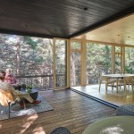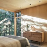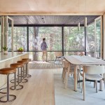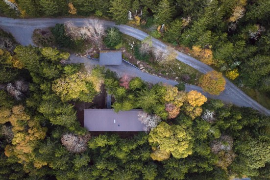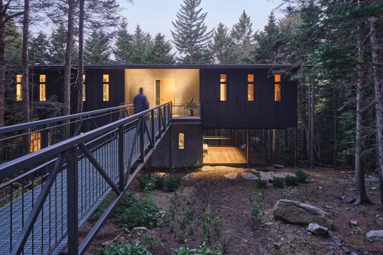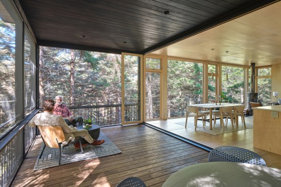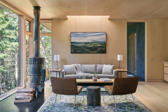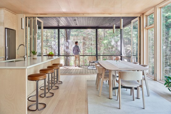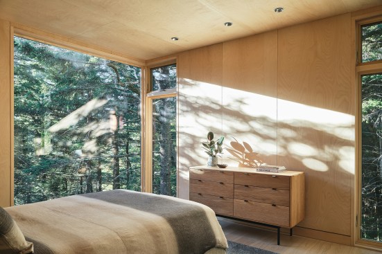 Elements meant to immerse the client and his guests in nature include an elevated footbridge connecting the parking area to the cabin’s entrance, three porches, floor-to-ceiling windows, and an 18-foot-wide folding door. Meanwhile, birch-plywood finishes imbue the spaces with welcoming warmth and simplicity.