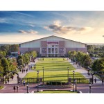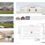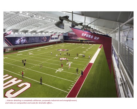 Other aspects of the design, in response to the building’s deceptive scale, were the decision to simplify and paraphrase the neoclassical language found on smaller scale buildings throughout campus. Simplification also allowed the design to respond to the traditional campus architecture without mimicking it. Additional compositional considerations, such as creating a water line that aligns with the awning over the main entry, respond playfully to the scale of the building, adding surprise as one approaches. Along the east and west facades, column covers are subtly sloped, giving way to translucent panels, evoking a sense of movement toward Garnet Way. Interior detailing is completely utilitarian, purposely industrial and straightforward, and relies on composition and scale for dramatic effect. An elevated filming and viewing platform also extends around half of the field perimeter.