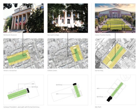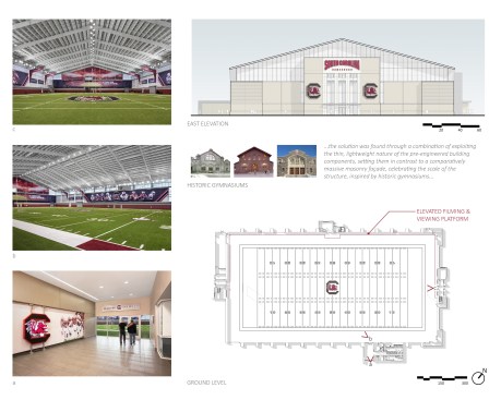 This Indoor Football Practice Facility completes the University of South Carolina’s “Gamecock Park,” providing a terminus to the pedestrian spine of this tailgating venue. Borrowing from USC’s historic quads, responding to the university’s traditional design standards, the axial east elevation evokes the language of terminus buildings on the central campus. The deliberately monumental façade stands in contrast to the straightforward pre-engineered metal building behind it, a design strategy driven by a modest budget combined with high expectations for a dramatic presence. Fully conditioned, it is the second intercollegiate football practice facility in the US to achieve LEED Silver certification.
