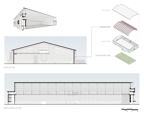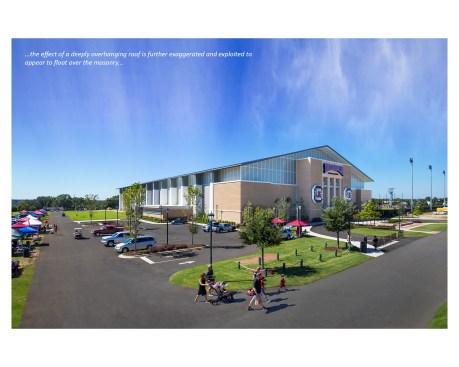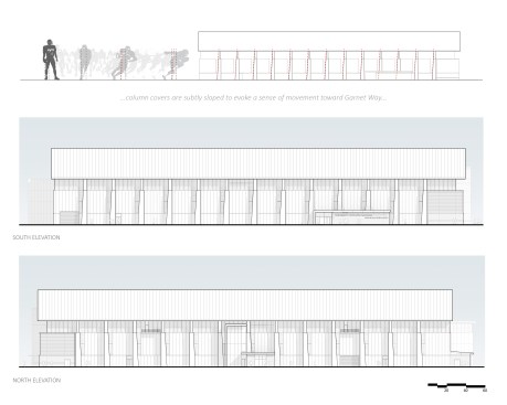 An exaggerated overhanging roof projects over the Garnet Way façade as well as the east and west façades. Because columns are required to be outboard of the walls, to eliminate unsafe projections of pilasters along the interior sidewalls, the effect of a deeply overhanging roof is further exaggerated and exploited to appear to float over the masonry. The masonry façade, in turn, thickens at the ends, reinforcing the contrast between massiveness and lightness. The main entry further anchors the building and is pulled away from the rest of the façade by means of a translucent glazed reveal. A broad expanse of translucent panels also separates the masonry below from the roof, admitting profuse diffused natural light onto the playing field.