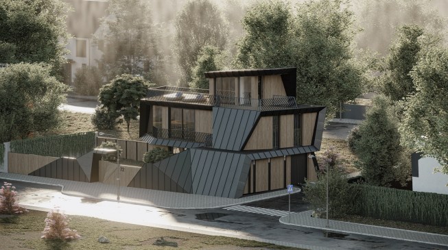 The surroundings are chaotically composed of various architectural styles and we wanted to bring a sharp and modern design into this environment, where it would stand out as a sculptural piece. The intention was to devise a captivating structure through simple shapes. We achieved this by tilting the planes as if these dark metal and wooden outer layers are folding ceaselessly into one another.