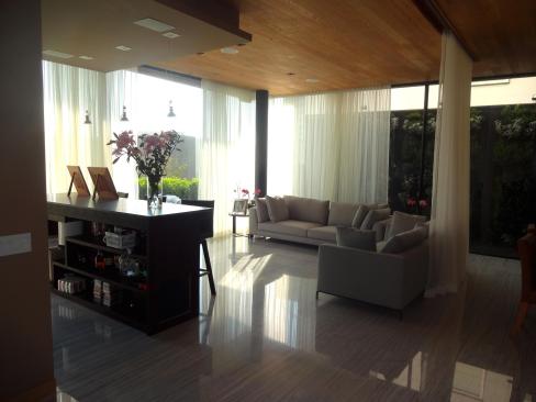 Once you are in you will be received by a fascinating tree and a floated staircase. All of which is illuminated through a skylight, creating a light and welcoming atmosphere. Then, there is a social area divided in two, one is more familiar and private, conformed by a family room and a nice terrace that leads to the backyard. The second one has a dining room, a living room and a bar that is surrounded by a lateral patio with a vertical garden and the backyard, creating a natural and relaxing surrounding. It’s important to mention that all the areas can be divided through the use of curtains in order to provide intimacy to its residents.