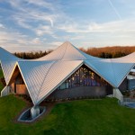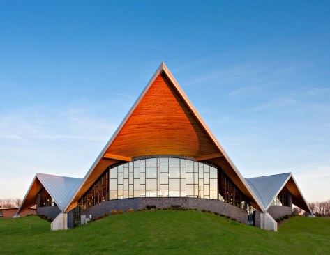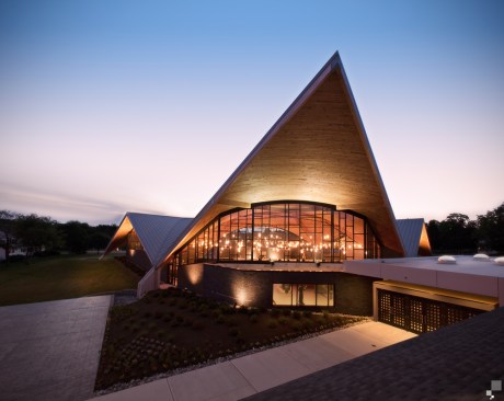 The hyperbolic paraboloid roof is used most often as an inexpensive solution to long-span roof requirements. As such, it is used for utilitarian purposes, such as sports arenas and athletic facilities. Both the project team and the Owner were enamored with the elegance of its form and the fluid lines consistent with those that one might expect to see in a fabric tent. The tent of St. Aloysius Church is fabricated from standing seam metal panels.