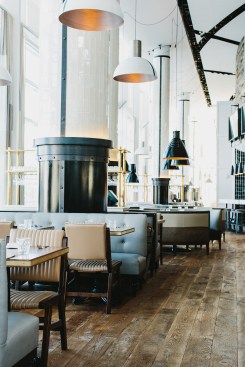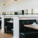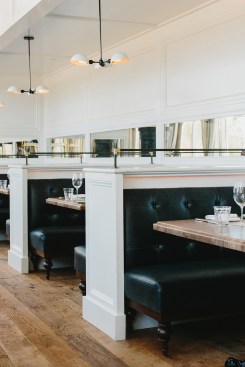 Built without any straight walls, St. Cecilia is light and airy, flooded by two floors of natural light. It features an open kitchen and floor-to-ceiling windows paired with beautiful custom patchwork curtain panels. Earnest details have been paired alongside locally sourced recovered hardwood floors, tile-clad Romanesque columns with blackened steel cases, steel straps and bolts, and stark metal industrial light fixtures that hang from soaring ceilings. All seating on the ground level dining was custom designed by Meyer Davis to complement one another in a collage of color and texture, from an inviting couch and leather-strapped club chairs in the lounge area to the round, free-floating banquettes that break up the center of the room, to plush tufted banquettes that hug the perimeter. A darker, more intimate seating area in the rear of the restaurant fits under the mezzanine of the private dining room. This area is complete with marine-blue leather banquettes and standout wooden tables. A bar-height communal table and an open, modern kitchen and prep area with new stonework finish off the dining area.