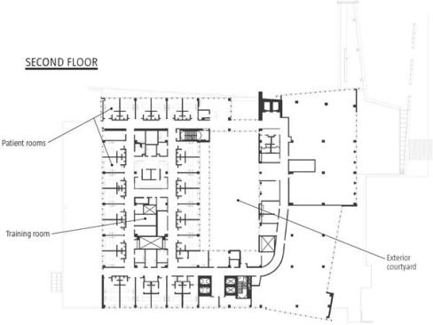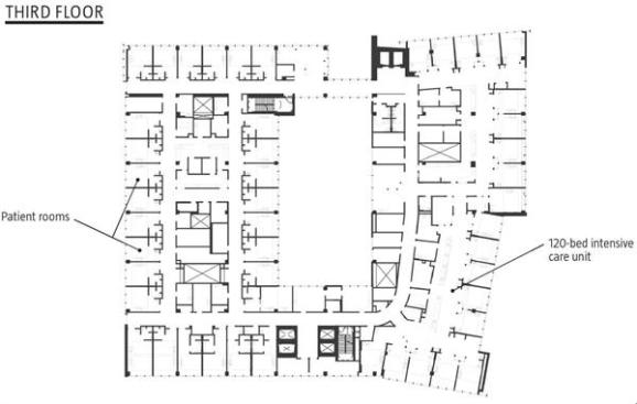 The hospital does not have LEED certification, but it is fundamentally a green building. As hospitals account for 8 percent of the nation’s energy-use, NBBJ sought to reduce energy consumption. The firm chose energy-efficient Solarban 80 windows, Lutron lighting controls with special sensors, and an energy efficient PVC roofing system. Other green measures include dark sky–compliant exterior lighting, a recycled aluminum curtain wall, low-emitting flooring, and a materials recycling program during construction.