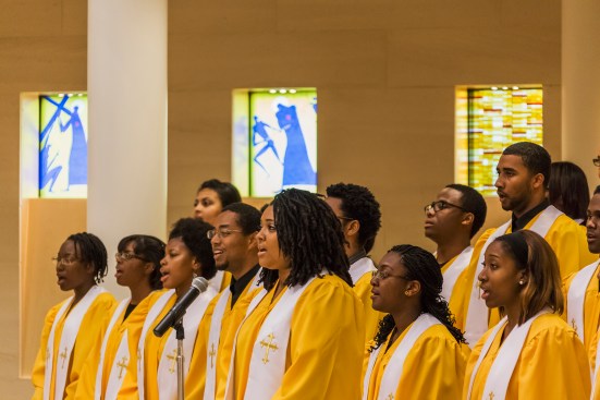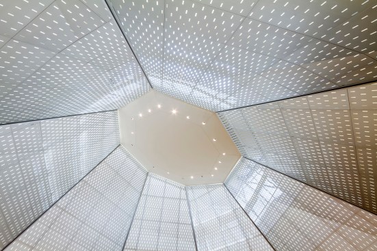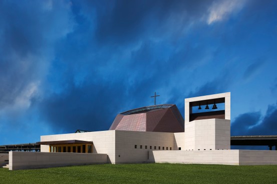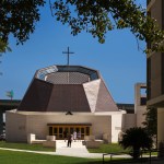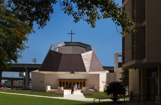 Named for Xavier University’s founder, the St. Katharine Drexel Chapel is a new central place of worship on campus. It has an octagonal plan, respecting the liturgical directions of Vatican II, with a limestone base crowned by a faceted copper roof topped with a 4.5-meter-tall (15-foot) cross. The building acknowledges the materials and colors of Xavier’s campus buildings and the architectural tradition of octagonal religious structures.