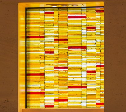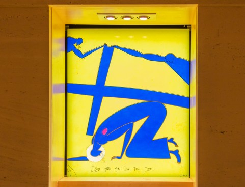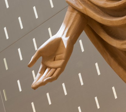 Inside the 430- seat sanctuary, the ceiling soars to sixty-five feet. Sunlight enters the space through a ring of skylights and is diffused through a perforated aluminum chancel screen on all sides. A twelve-foot-tall “risen” Jesus hovers above a limestone altar instead of being on a crucifix, and colorful art-glass windows surround the space: the fourteen Stations of the Cross by Cuban artist José Bedia and abstract tapestry-like compositions by New Orleans glass artist Laurel Porcari.