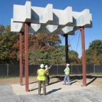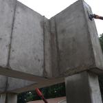 The concrete for the slab—all 1,600 cubic yards of it—was poured in 11 sections, each consisting of up to 28 truckloads of concrete. First, the construction team tied together the grids of rebar (assembled above the formwork for the slab) and dropped them into the gridded voids. When the concrete trucks arrived site, “it was a ballet,” McFarland says.“It was fun to watch these things come and go.” The longest pour was the first, which lasted two hours.