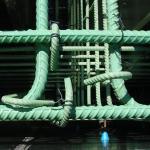 As one would expect of Chipperfield, the geometry of the grid slab is rigorous: 5-foot-by-10-foot voids, dubbed coffers, are partitioned by 1-foot-thick concrete ribs. The 4-foot-tall slab was poured on site after the vertical structure of columnar supports and concrete exterior walls (which serve as shear walls) was already in place. To execute what would essentially be an aerial pour, the team built a temporary plywood platform, which it called “the dance floor,” 18 feet above the floor slab. Disrupted only by the column caps that would connect with the ceiling slab, the platform formed the base for the formwork.
