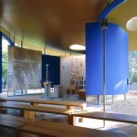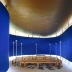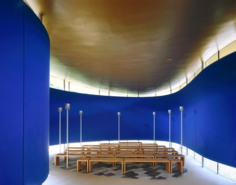 This allows daylight to stream inside through the strips of glass that run above and below the wall, creating an ethereal quality of light that heightens the spiritual experience of being between heaven and earth. Adorning the intense blue wall are texts from the Requiem in Paradisum in various languages​, a reference to the surrounding multicultural neighbourhood. Placed opposite one another, the entrance and exit are oversized pivot doors integrated into the wall.