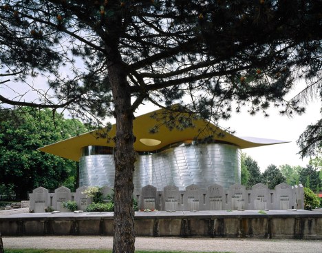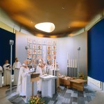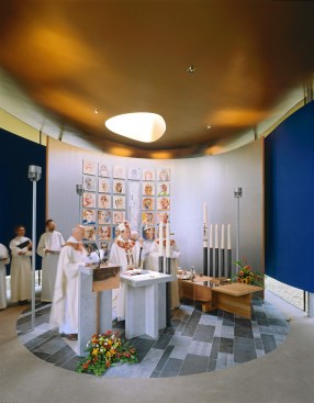 Torch-like lamps illuminate the gold-coloured ceiling from the inside out. A light beam falls into the chapel through an opening in the roof, accentuated by the rising smoke of burning incense. Circular sections of inlaid stone in the floor indicate the areas designated for funeral goers and priests. A modest bell tower crowns the structure.