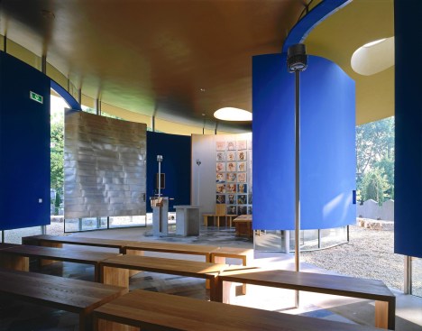 Inside, the atmosphere feels intimate regardless of the number of people present. The chapel consists of a column-free space wrapped by a continuous, undulating wall raised seventy centimetres off the floor, with a gently curved floating roof above.