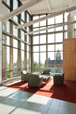 The facility earned Platinum level certification as quantified by the United States Green Building Council’s Leadership in Energy and Environmental Design (LEED) rating system. This facility is among the first major science facilities in the country designed with an emphasis on “green chemistry,” a developing trend that seeks to minimize the need for hazardous chemicals in lab experiments. As a result, the building has significantly fewer fume hoods than the old science building, thus furthering the College’s ongoing theme of environmental sustainability.
