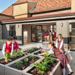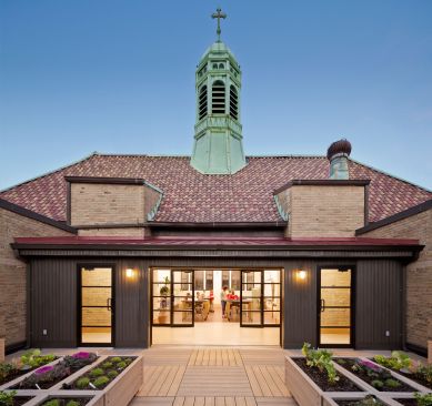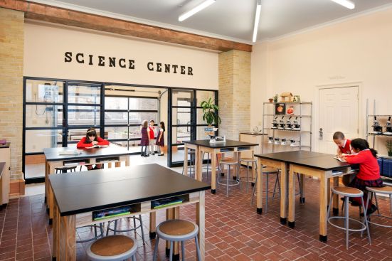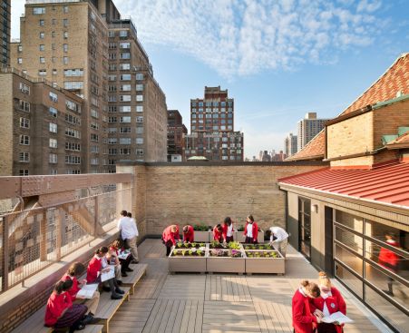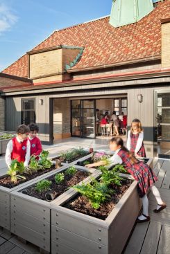 In just a few years the leadership for this K-8 parochial school has transformed its programs and pedagogy to better serve its community and prepare its students for the world today. Tradition and innovation guide ongoing design and construction work to retrofit the existing historic building and to plan a dramatic extension in 2015. Phase 1, completed this past summer included transforming underutilized roof terrace space into an environmental science lab that has both indoor and outdoor leaning spaces, connected by a glass garage door. In addition the roof terrace’s mobile planters can be pushed to the side to allow for large social events both day and night. The indoor lab hosts board meetings.