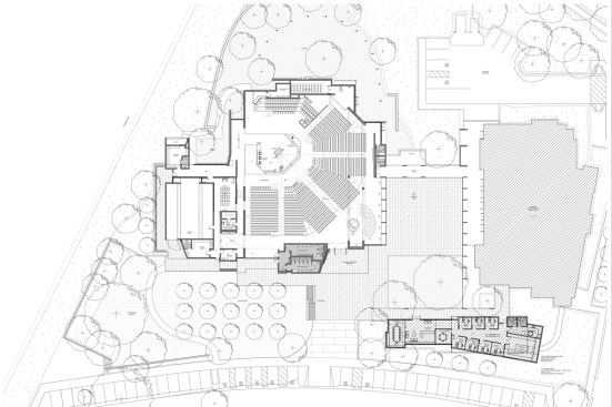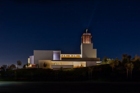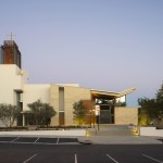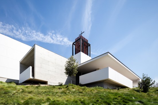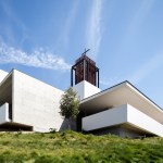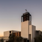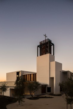 The church is built on the highest elevation of the site, with a 60 foot bell tower lending visibility and definition from afar. The solid volumes flanking the bell tower oppose harsh Western sun with staggered walls and clerestories that filter light softly into the interior.