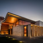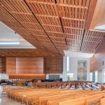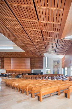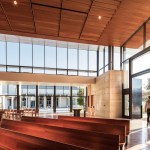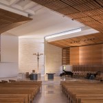 Inside, the design of the sanctuary celebrates the congregation itself as the center of liturgy. Pews made of cherry wood from the Pacific Northwest are arranged in a semicircular layout to encourage interaction and visibility among parishioners. Overhead, cherry ceiling louvers envelope the congregation and choir, providing a sense of warmth and unity.