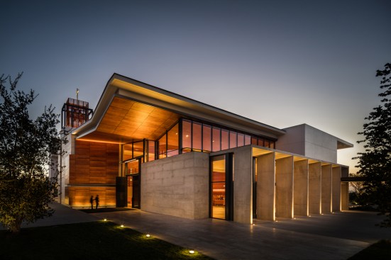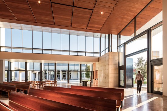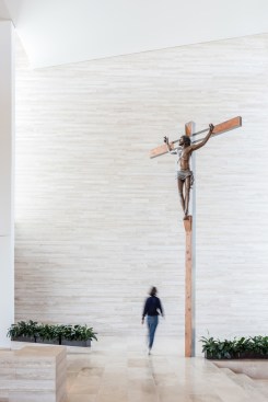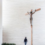 At the altar, angled walls of cross-cut Chilean travertine and raw concrete deliver diffuse light onto the sanctuary’s focal point—the crucified corpus. The bronze sculpture was created by artist Lynn Kircher; the cross frame by Renzo Zecchetto Architects.
