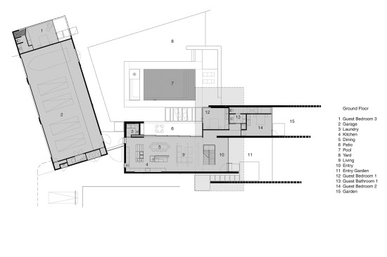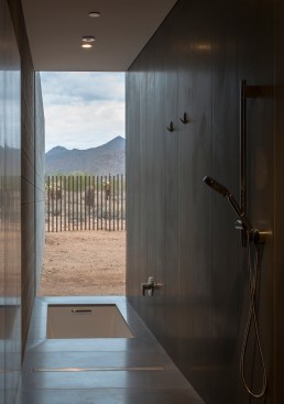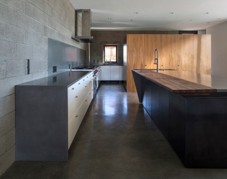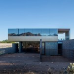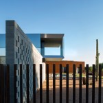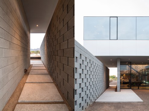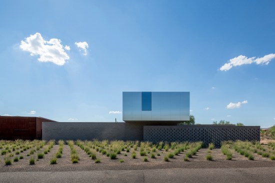 In this Scottsdale, Ariz., suburban neighborhood of single-acre lots, the 3,384-square-foot Staab Residence was designed by local firm Chen + Suchart Studio to shield itself from its undistinguished neighbors and maximize the stunning views of the desert. Sandblasted masonry walls enclose a first-floor living space whose floor-to-ceiling sliding glass panels open onto a courtyard and pool. Two private guest rooms enjoy carefully framed, yet distinct, relationships to the landscape. The second-floor master suite floats above the masonry walls and is minimally sheathed in stainless steel and glass that dramatically reflects the sky and nearby McDowell Mountains. The garage and a third guest room occupy a Cor-Ten-clad structure that provides a strong counterpoint to the principal volumes of the house. —Edward Keegan, AIA