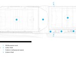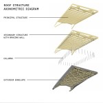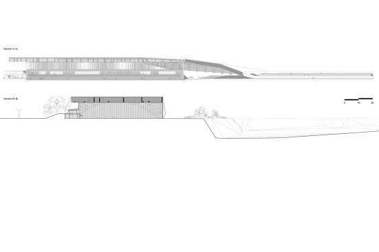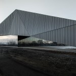 The central idea evident in the initial project sketch—a geometrically complex volume that echoes the craggy excavated face of the quarry—helped the project win a 2014 Progressive Architecture Award from ARCHITECT, and the concept has been fully realized in the built project, which opened last year: The regulation-size indoor soccer field is covered by a spectacular clear-span timber roof with an exposed, seemingly random but highly rational grid of beams on the diagonal. A slim two-story volume along one flank accommodates locker rooms, a fitness and physiotherapy room, an event space, a food court, and offices for the regional soccer association.