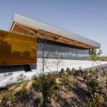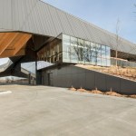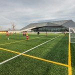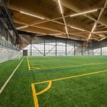 The exterior is clad in zinc to tie it thematically to the quarry’s geological and mineral history, and a high-performance glass envelope blurs the inner and outer landscapes. Two “shoulders” of structure at the northwest edge of the indoor field extend out and fold down to form spectator seating on one side of an adjacent exterior field and a wall with team benches on the other.