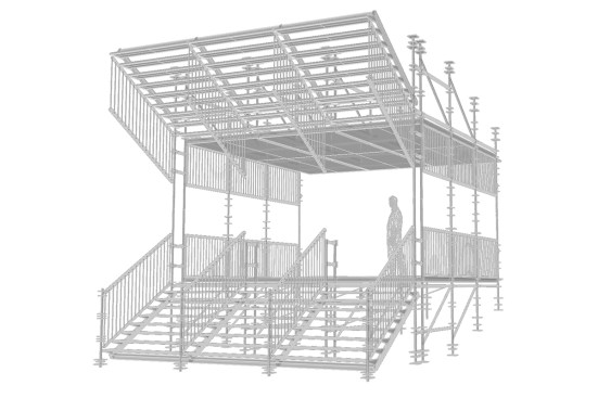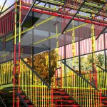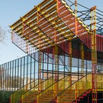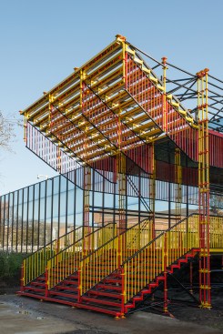 The Trade Mart has an interesting façade, with its vertical alignment and bronze coloured mirrored panels, which reflect the thick vegetation of the surroundings. The existing staircase is made of scaffolding, an element both stable and ephemeral, which can be assembled and dismantled countless times. This structure itself therefore suggests a poetic concept of enduring time and transformation. For this very reason, we have preserved the staircase.